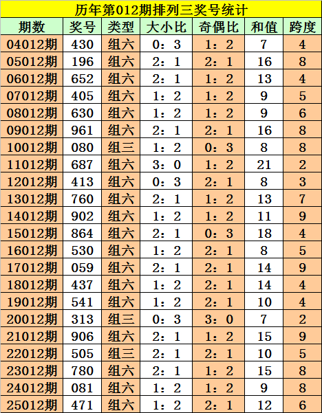 历年第012期排列三奖号:430 - 196 - 652 - 405 - 630 - 961 - 080 - 687 - 413 - 760 - 902 - 864 - 530 - 059 - 437 - 541 - 313 - 906 - 505 - 780 - 081 - 471。