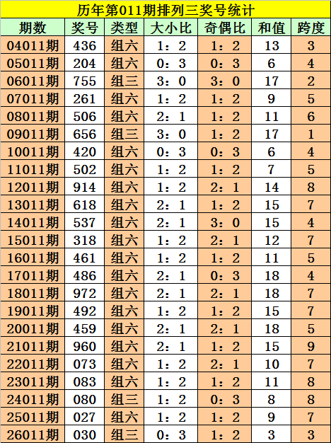 排列三第2026011期奖号:030,和值3,跨度3,大小比0:3,奇偶比1:2。