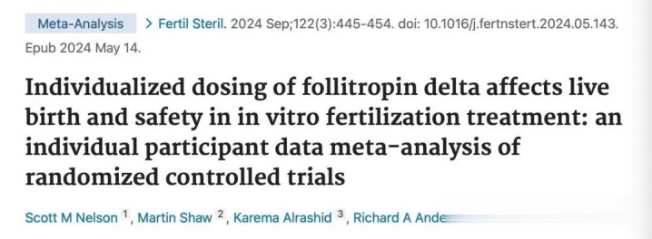 Individualized dosing of follitropin delta affects live birth and safety in in vitro fertilization treatment: an individual participant data meta-analysis of randomized controlled trials. Fertil Steril. 2024 Sep;122(3):445-454. doi: 10.1016/j.fertnstert.2024.05.143. Epub 2024 May 14.