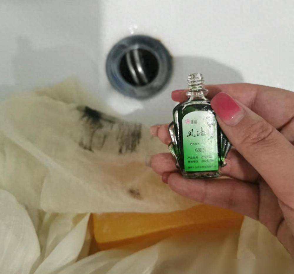 因为有了风油精这种神器,只需将适量的风油精涂抹在脏污处,然后静置片刻再轻轻搓揉,就能发现黑色污垢被完全分解,可以轻易地洗掉。